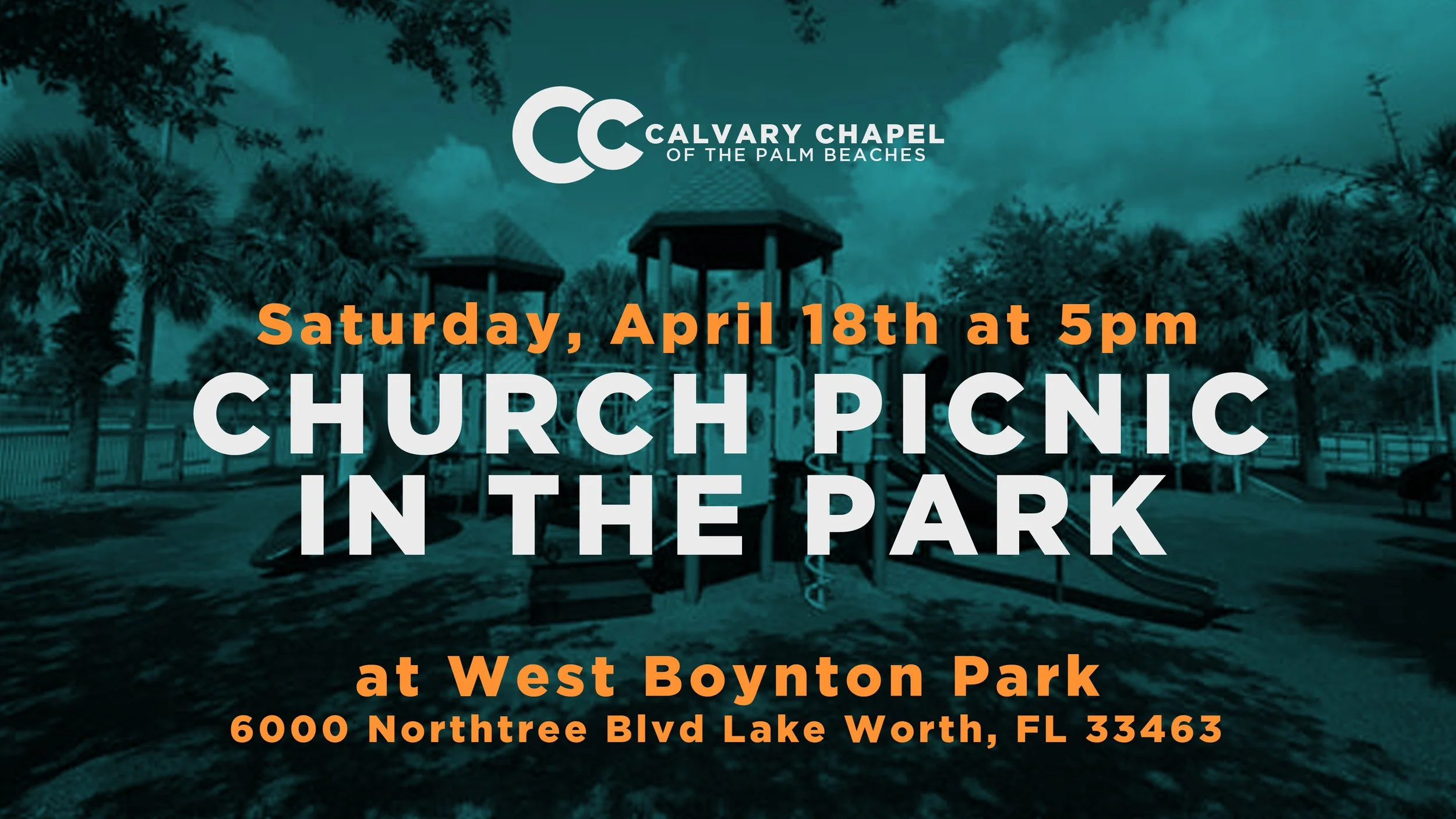 Everyone is invited to come join us for a CHURCH POTLUCK PICNIC in the park at West Boynton Park on Saturday, April 18th at 5pm with a time of fellowship and a picnic dinner.