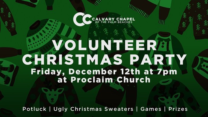 Join us on Friday, December 12th for our Annual Volunteer Christmas Party as we CELEBRATE and APPRECIATE all of our amazing, incredible volunteers at Calvary Chapel of the Palm Beaches! Wear an UGLY CHRISTMAS SWEATER (there will be prizes!!!) and bring a dish to share.